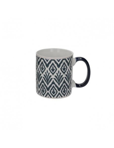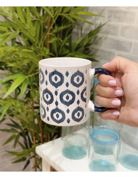 Taza de cerámica en blanco con estampado étnico en azul marino y asa a juego.