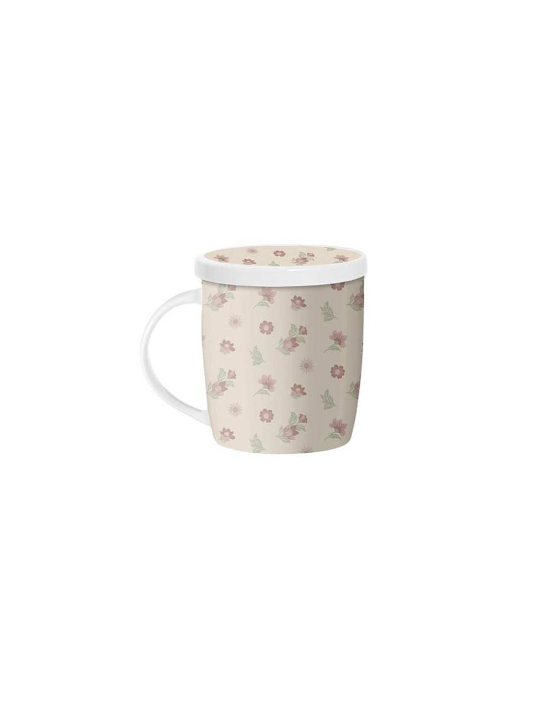 Bonita taza con filtro interior y tapa a juego, decorada con un delicado estampado floral en tonos suaves.
