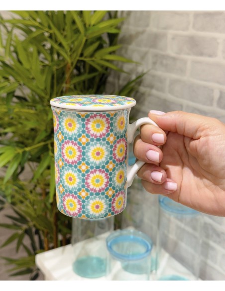 Bonita taza de porcelana con estampado floral geométrico en tonos alegres, con tapa a juego y colador.