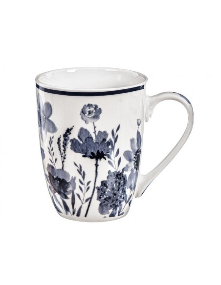 Taza fabricada en cerámica de color blanco estampada con flores en tonos azules.