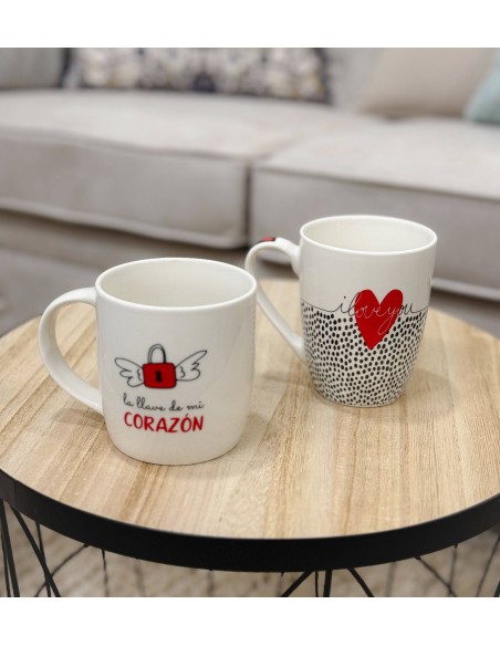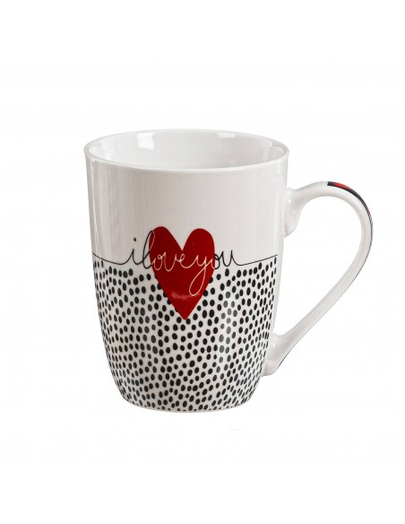Bonita y sencilla taza de cerámica en color blanco con un diseño de topos negros un gran corazón rojo en el centro con la frase "i love you".