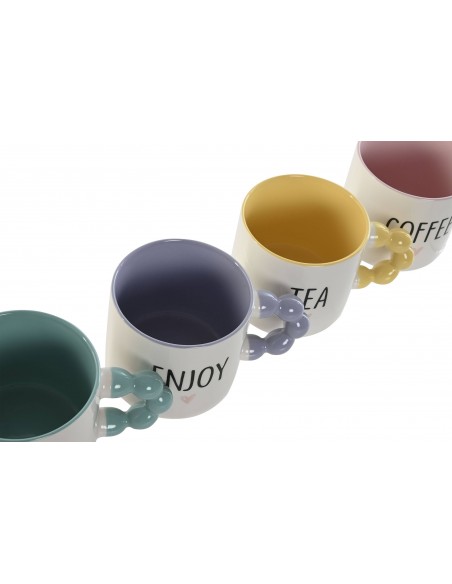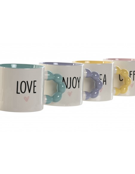 Hecha de porcelana, con asa burbuja en tonos pastel y mensajes como LOVE, ENJOY, TEA o COFFEE.