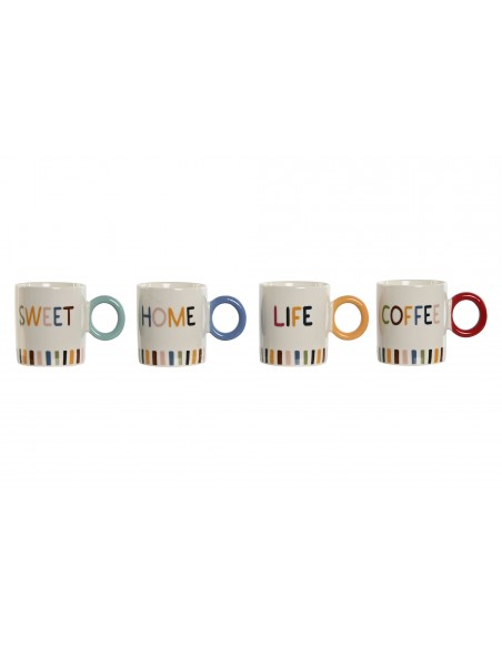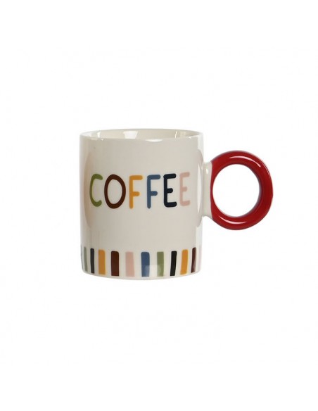 Original y gran taza de porcelana blanca con un diseño multicolor de rayas en la parte inferior, una palabra en inglés y el asa redonda.