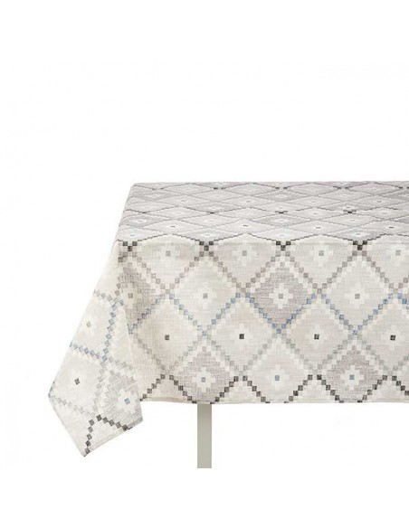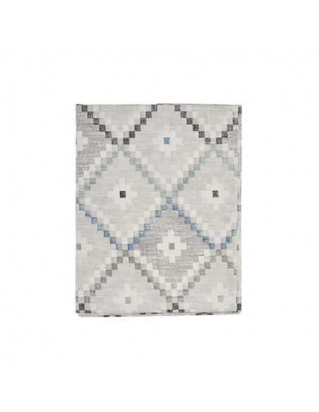 Este elegante mantel estampado con un diseño geométrico en tonos grises, azules y blancos es perfecto para darle un toque moderno y sofisticado a tu mesa.