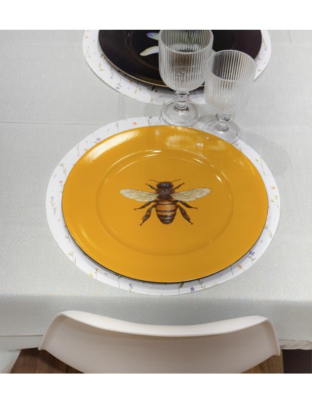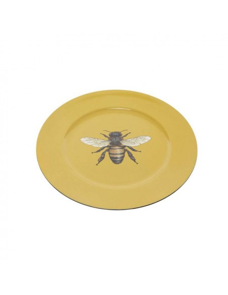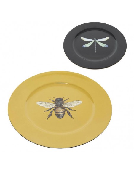 Bajoplato con diseño de abeja o libélula sobre fondo amarillo o negro, con acabado brillante y detalles que aportan un aire artístico y muy actual.