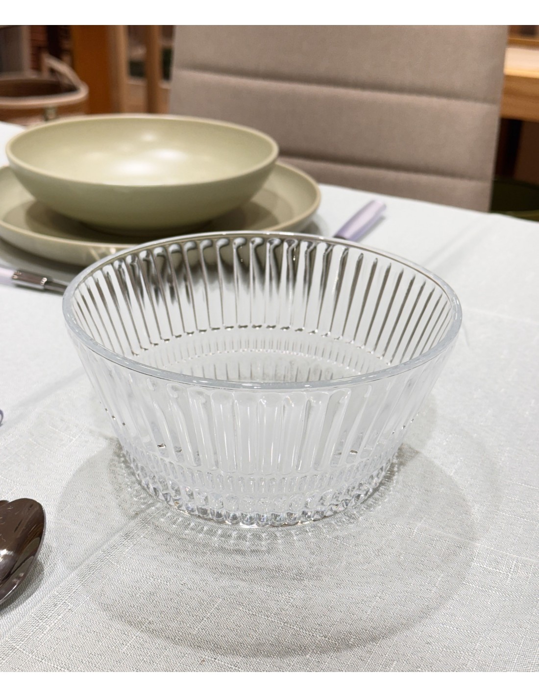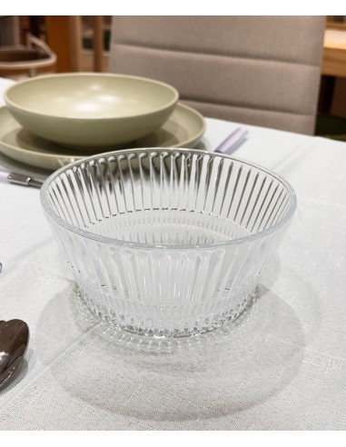 Sencillo y elegante, este bol de cristal transparente destaca por su diseño con relieve lienal que le aporta un estilo atemporal y muy versátil. Su forma redondeada lo hace práctico y cómodo para el día a día.