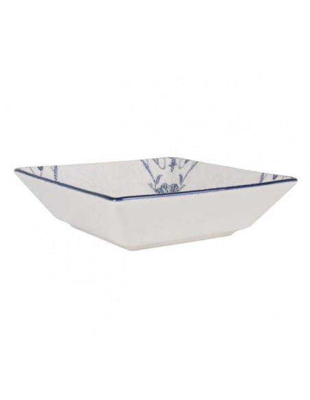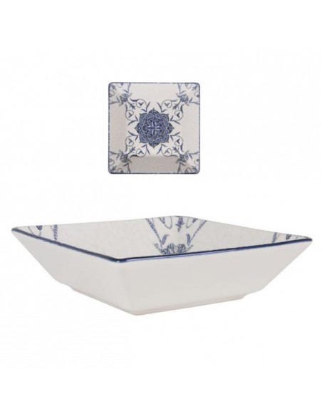 Bol cuadrado blanco con borde azul marino de estilo mediterráneo con un diseño de imitanción mosaico central en diferentes tonos azules con la forma de una gran flor.