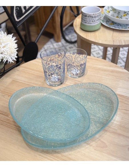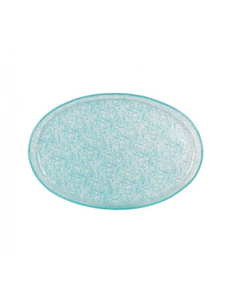 Agregue un toque de elegancia a su mesa con esta fuente de cristal en tono azul turquesa. Su diseño ovalado y textura sutil crean un efecto visual único, ideal para servir tus platos con estilo.