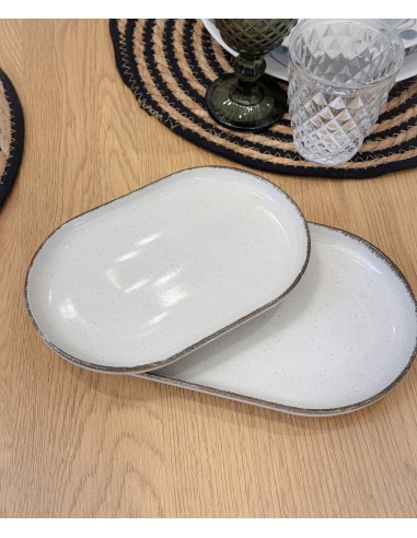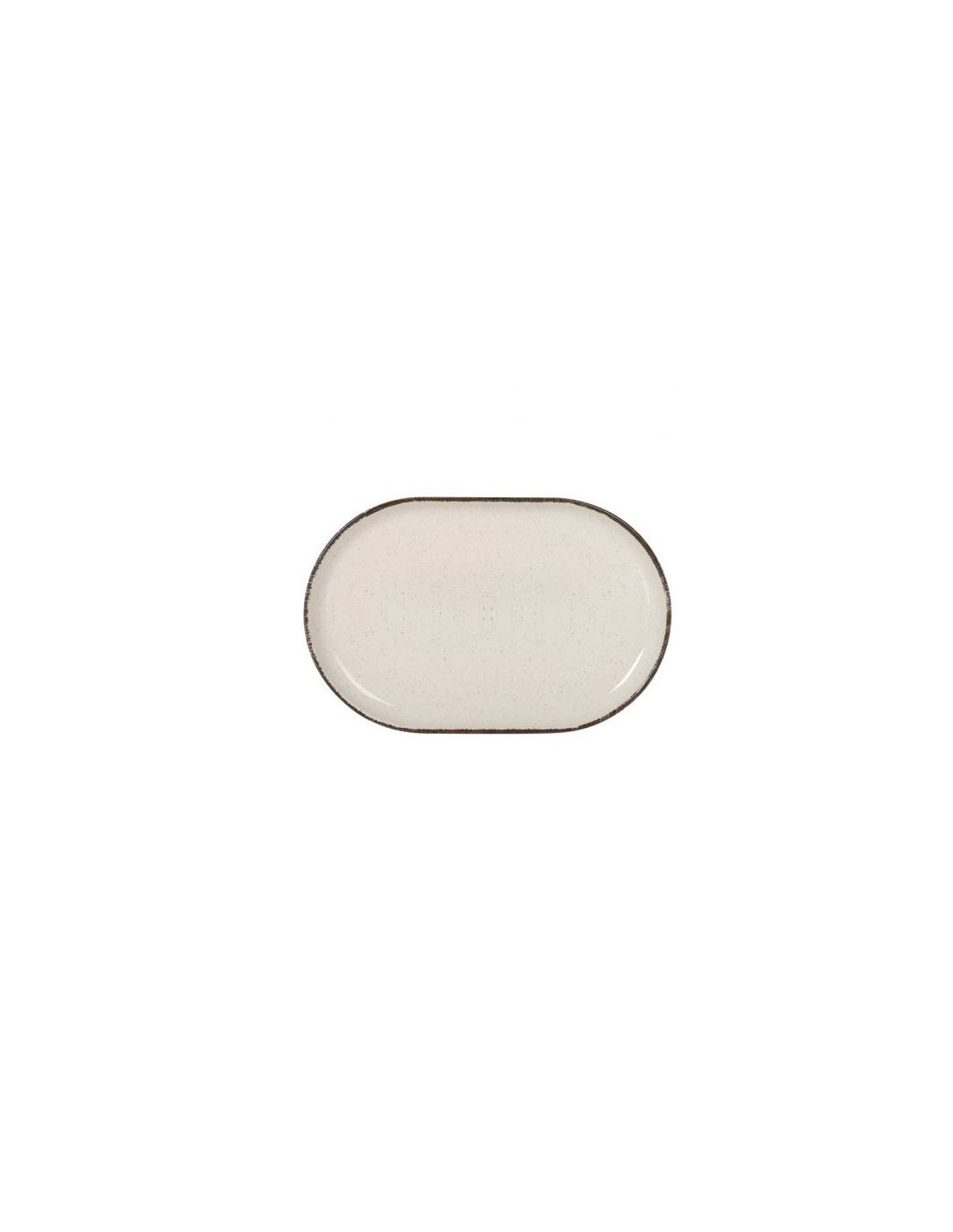 Bonita fuente en forma ovalada, con acabado en esmalte crema moteado y borde en tono marrón oscuro que le da un aire cálido y artesanal.