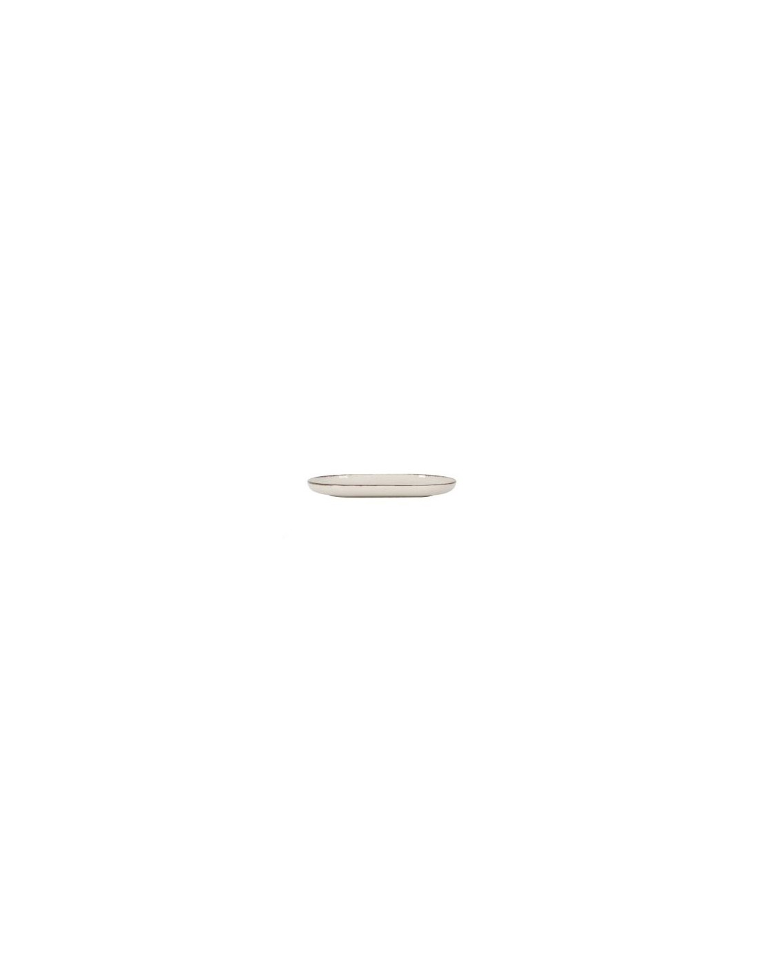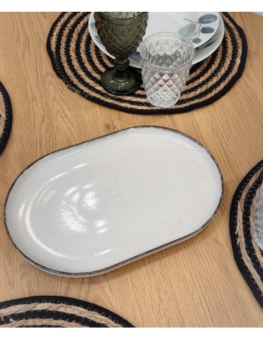 Bonita fuente en forma ovalada, con acabado en esmalte crema moteado y borde en tono marrón oscuro que le da un aire cálido y artesanal.