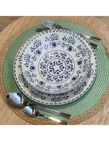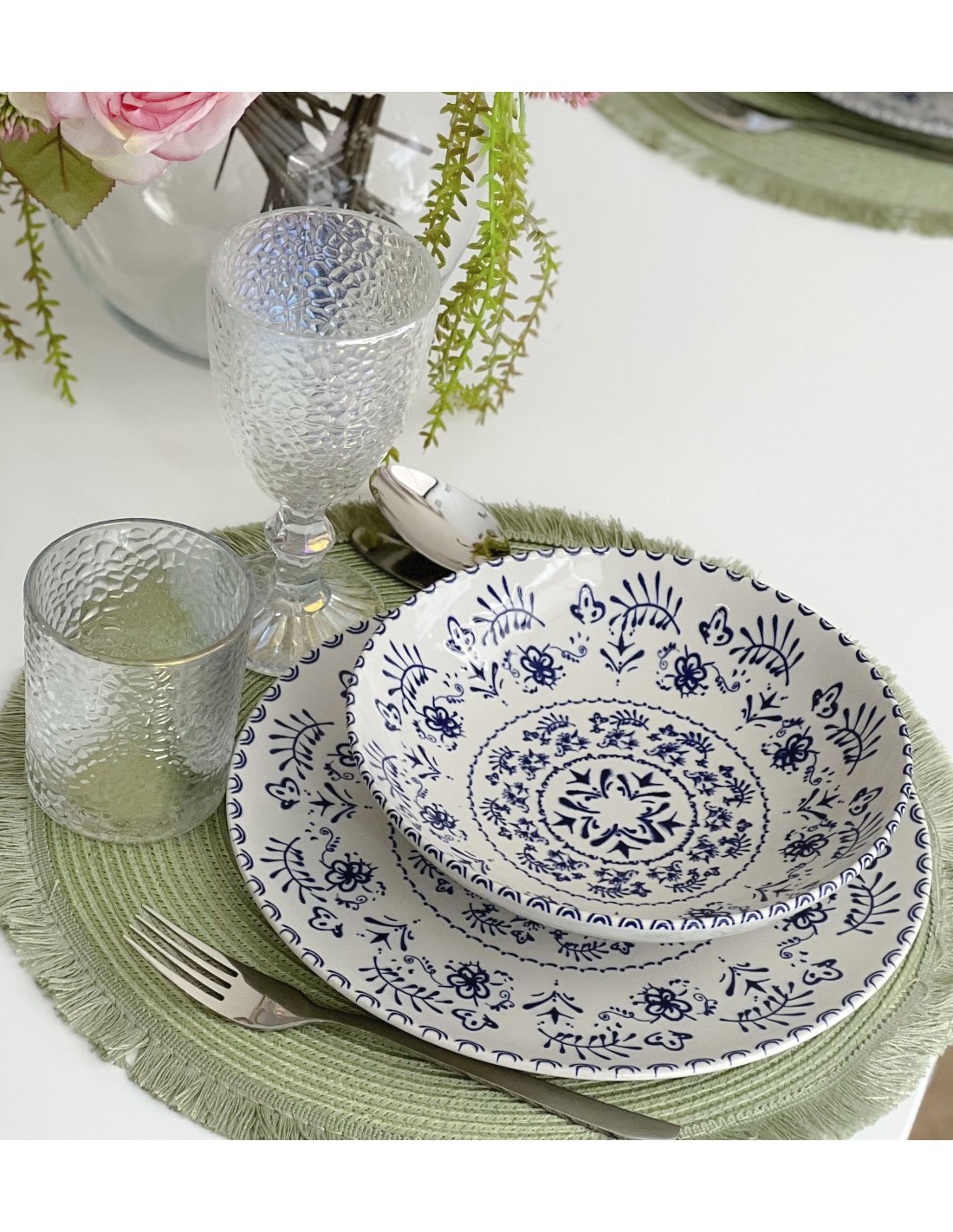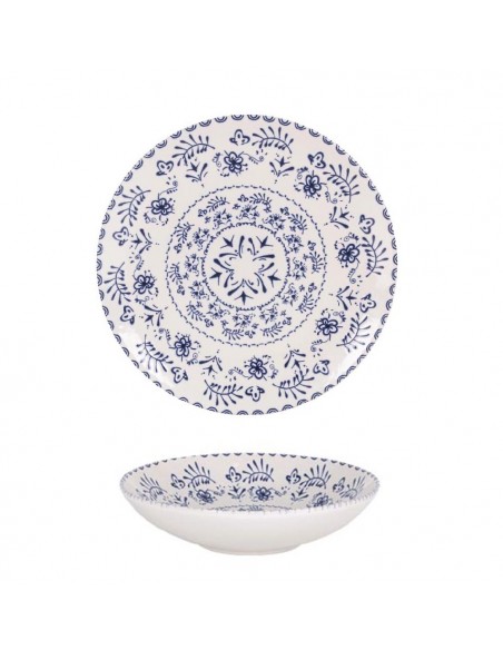 Si quieres ser la anfitriona perfecta esta vajilla es ideal para ti, plato hondo en color blanco con un llamativo diseño floral azul de estilo mediterráneo.