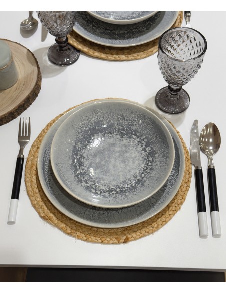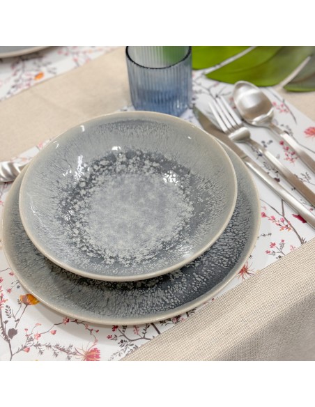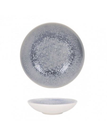 Plato redondo hondo con un efecto de pintura en tono grisáceo azulado que le da un apecto muy natural.
