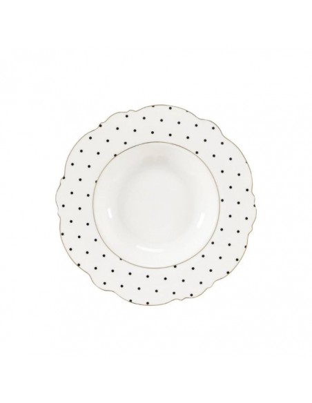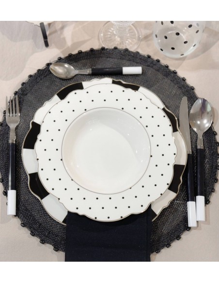 Su diseño de topos en blanco y negro junto con el reborde dorado aporta un aire sofisticado y moderno a tu mesa. Ideal para ocasiones especiales o para darle un toque diferente a tu vajilla diaria.