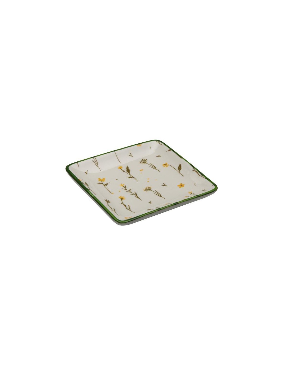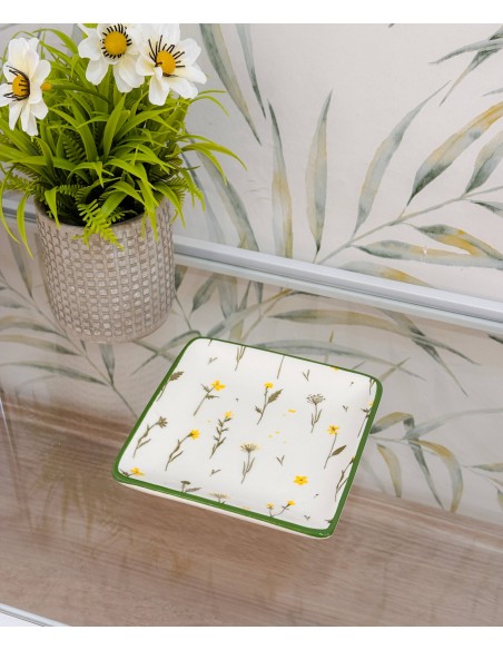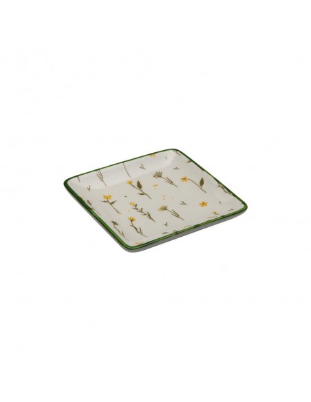 Bonita fuente cuadrada de porcelana con delicado estampado de flores silvestres en tonos amarillos y verdes. Su borde verde resalta el diseño natural, aportando un estilo fresco y alegre a tu mesa.