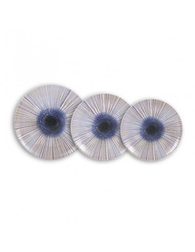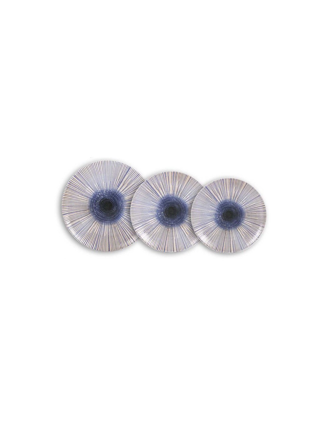 Original vajilla en tonos neutros con un llamativo diseño de líneas radiales en azul que parte del centro y crea un efecto visual vibrante y moderno.