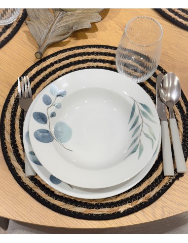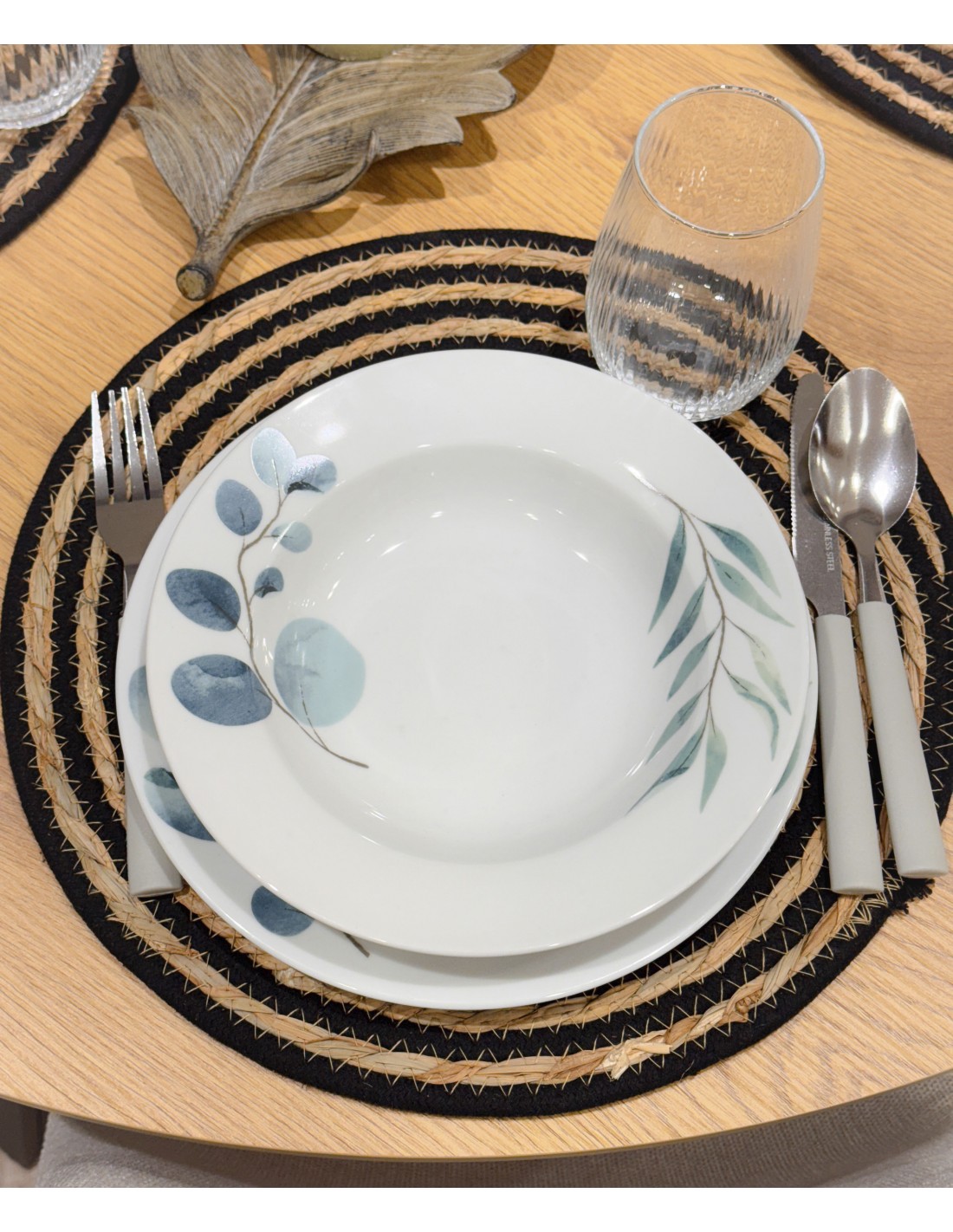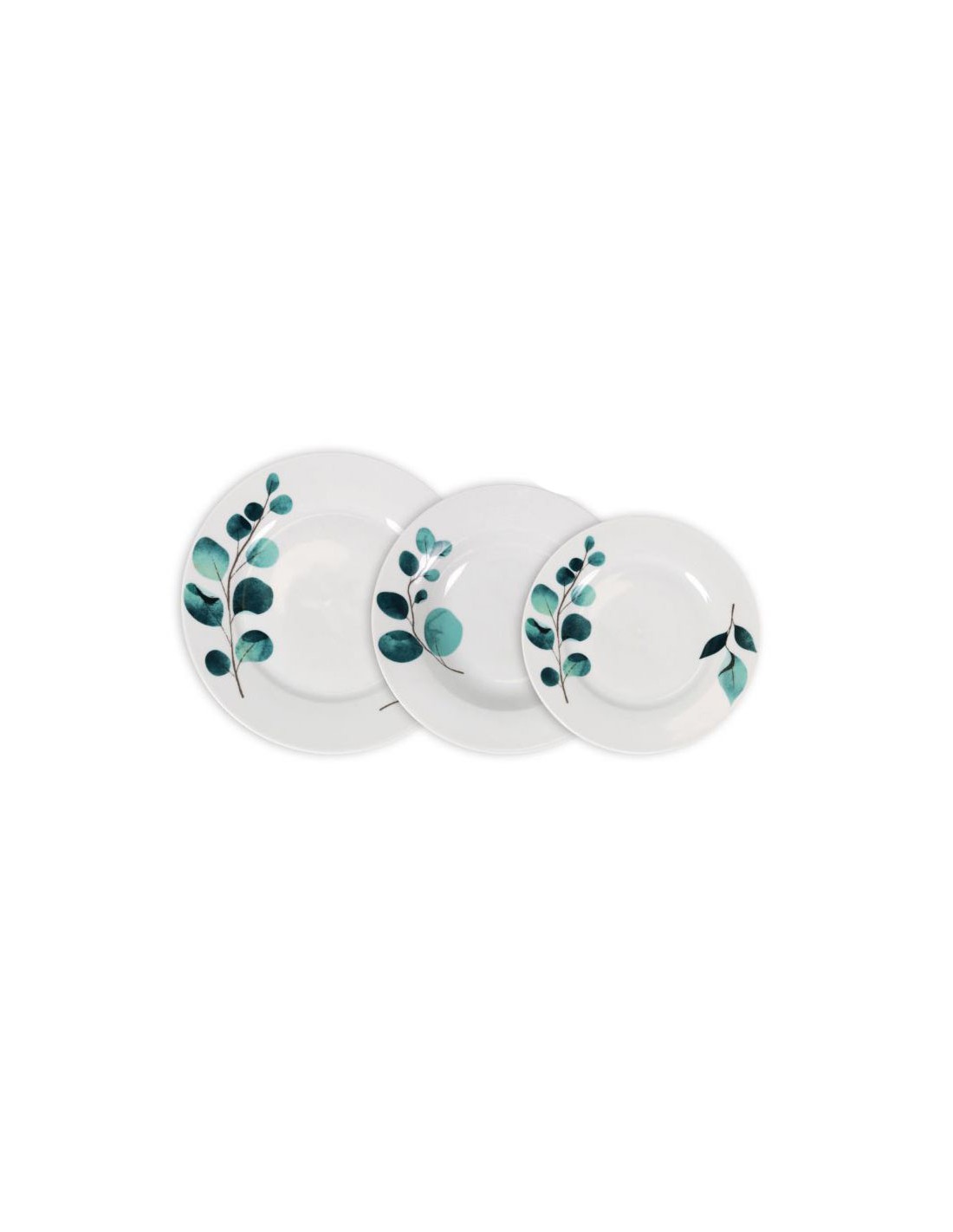 Vajilla compuesta por 18 piezas con un diseño fresco y natural de ramas en tonos verdes sobre fondo blanco. 6 platos llanos de 24cm, 6 hondos de 21,5cm y 6 platos de postre de 19cm.