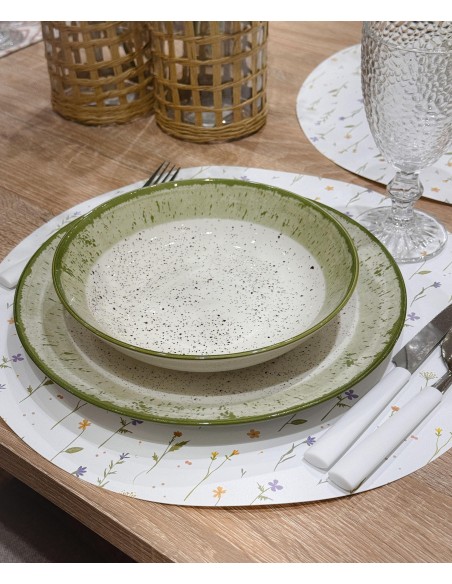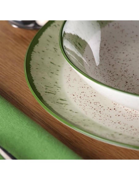 Vajilla de porcelana con un diseño encantador en blanco con motitas marrones y borde verde tipo pincelada.