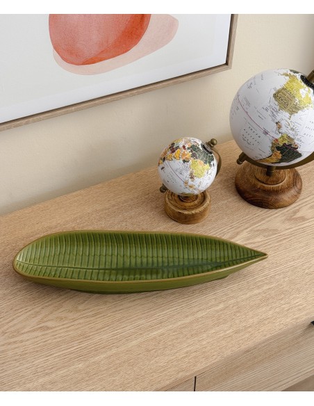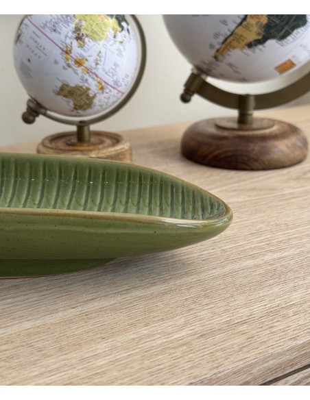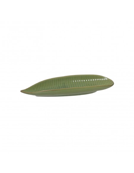 Original bandeja en forma de hoja alargada, fabricada en cerámica con esmaltado verde y textura marcada.