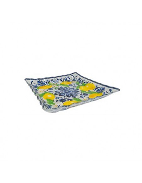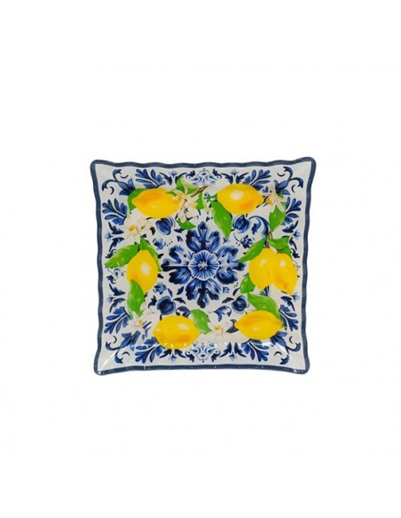 Colorida bandeja cuadrada de cristal decorada con limones y motivos florales en azul intenso.