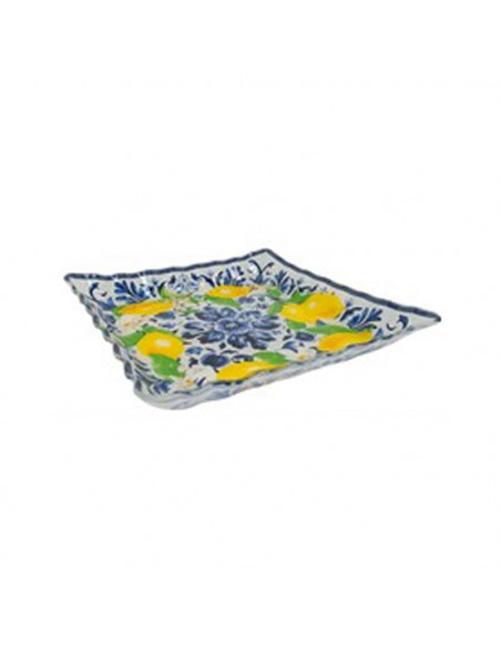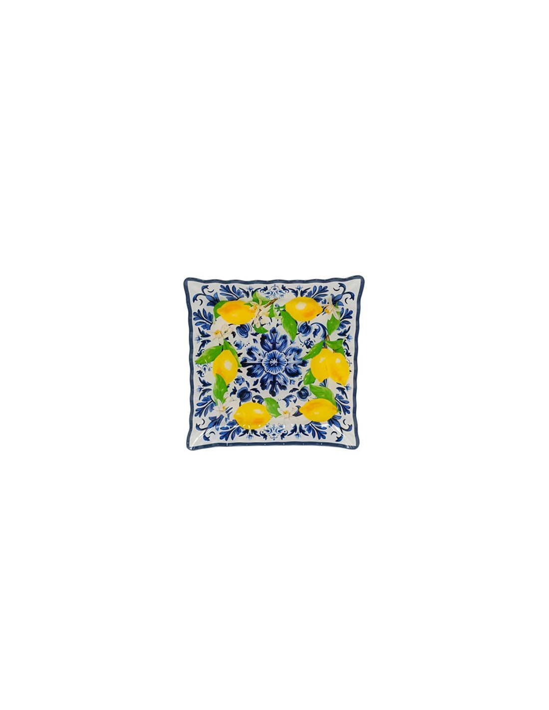 Colorida bandeja cuadrada de cristal decorada con limones y motivos florales en azul intenso.