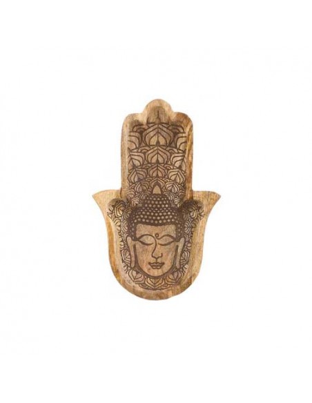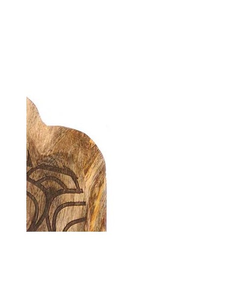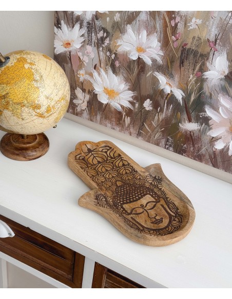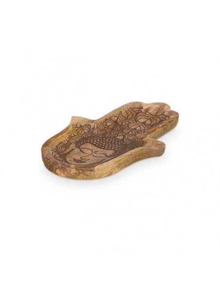 Original bandeja de madera tallada en forma de mano de fátima con grabado decorativo.