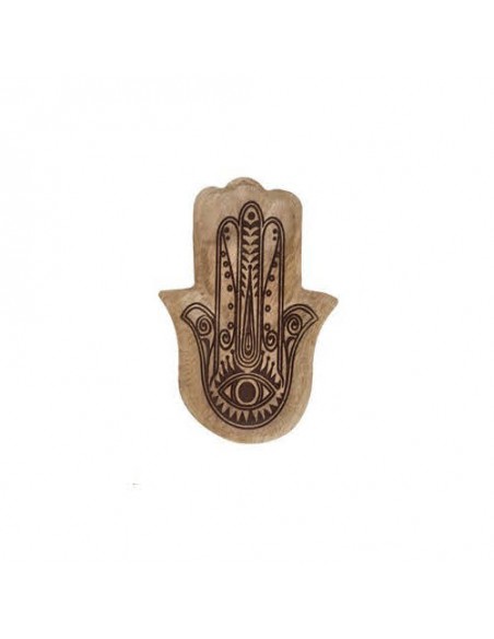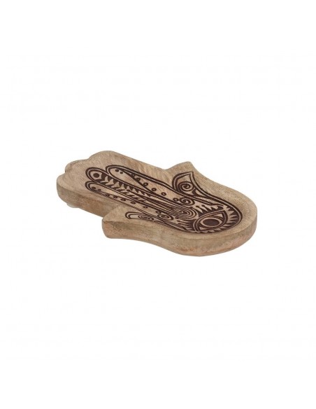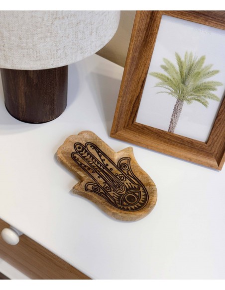 Bandejita de madera tallada en forma de Mano de Fátima con un grabado en tonos oscuros que resalta cada detalle. Su diseño artesanal aporta un aire étnico y protector, convirtiéndola en un objeto decorativo lleno de significado y estilo.