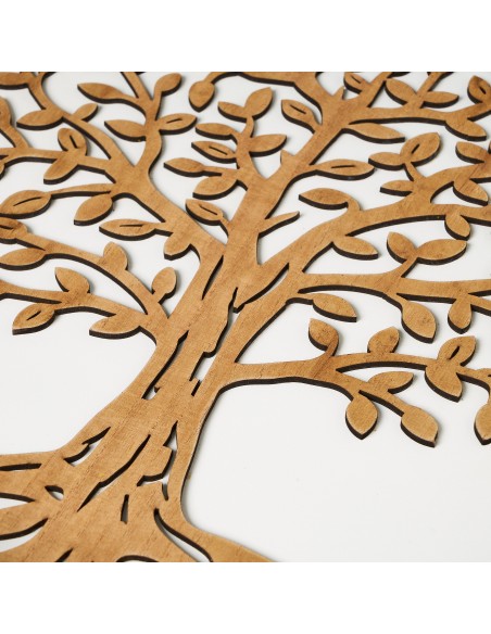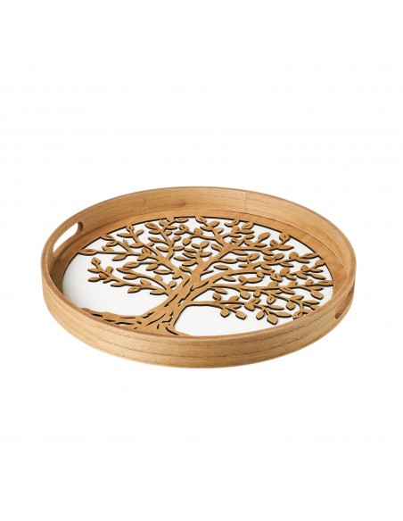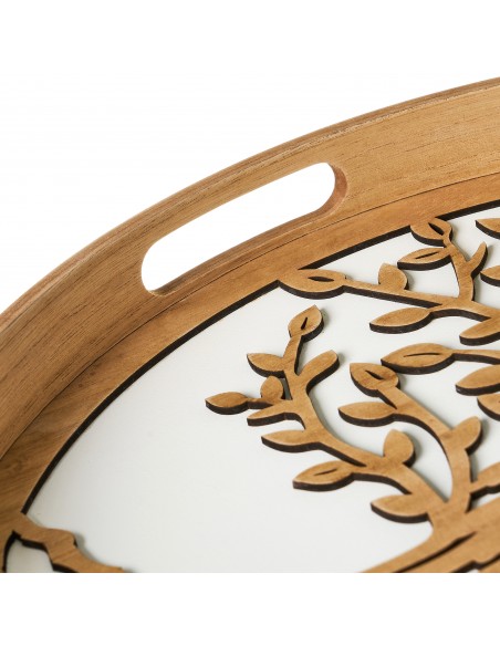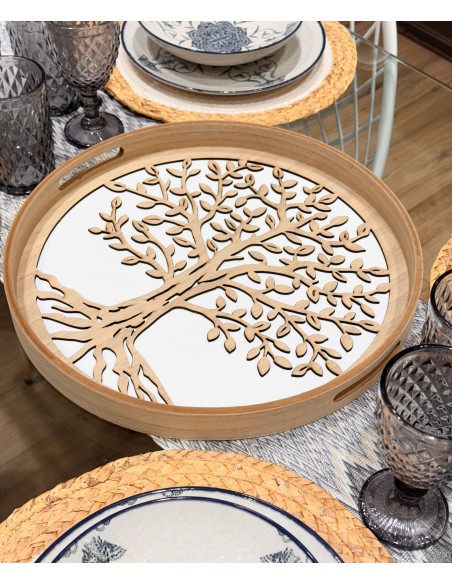Bonita bandeja redonda fabricada en madera MDF, con un llamativo diseño calado en relieve en forma de árbol sobre fondo blanco.