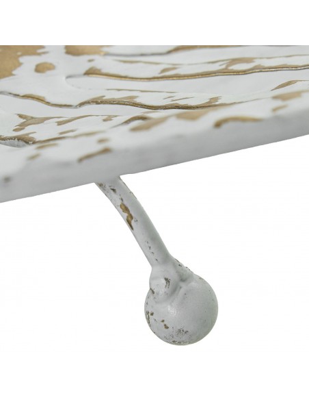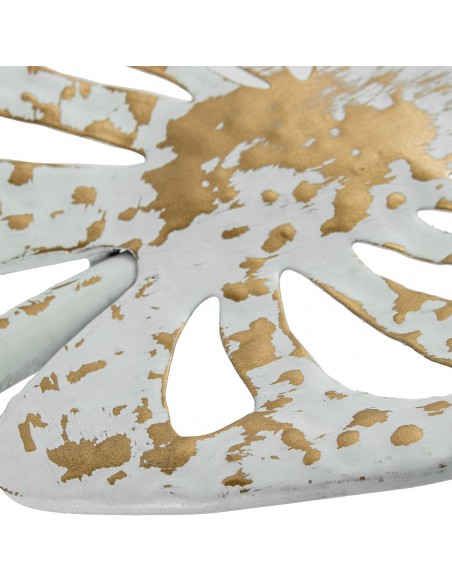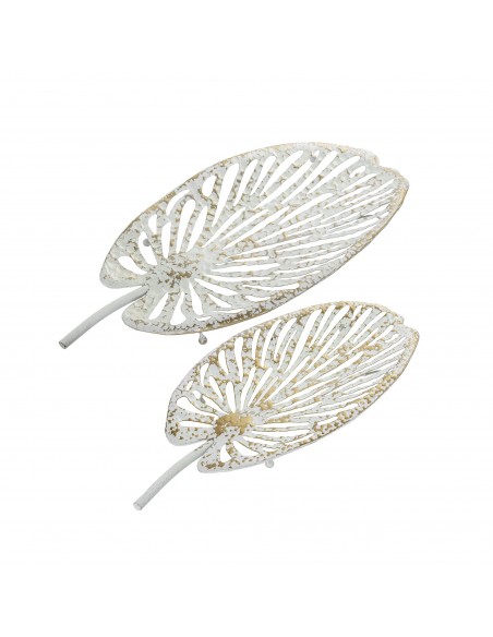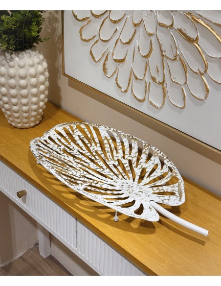 Original bandeja metálica en forma de hoja, con acabado calado en tonos blanco y dorado envejecido. Su diseño ligero y con relieve la convierte en una pieza llamativa que añade elegancia a cualquier espacio.