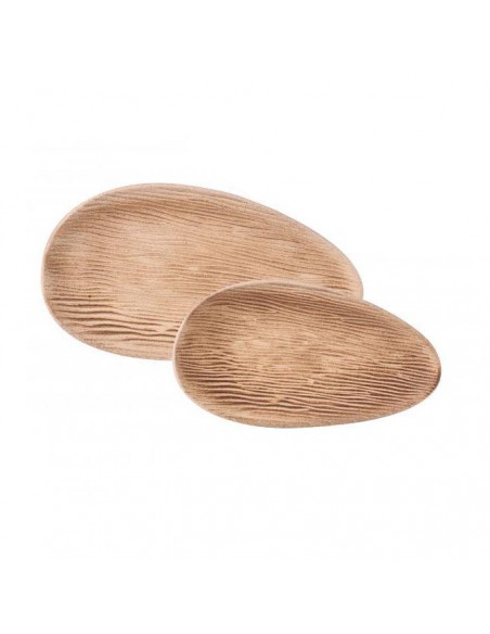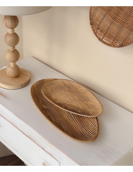 Bonita y sencilla bandeja vaciabolsillos fabricada en madera de color natural de forma ovalada y con una textura rayada en su parte superior además de un efecto quemado.