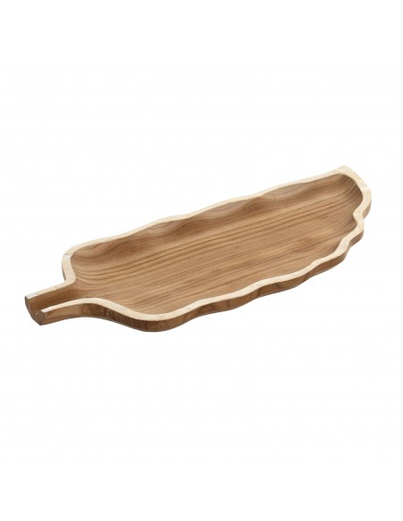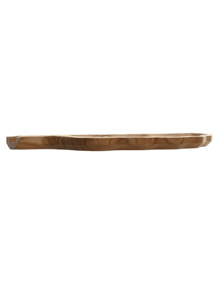 Bonita bandeja decorativa fabricada en madera de teca, con un diseño inspirado en la forma de una hoja. Su acabado natural y sus vetas únicas aportan calidez y estilo, combinando fácilmente con cualquier tipo de decoración.