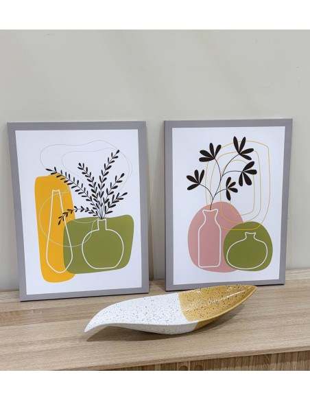 Bandeja decorativa fabricada en cerámica combinando blanco y mostaza con textura arenosa y un diseño de salpicaduras de pintura.