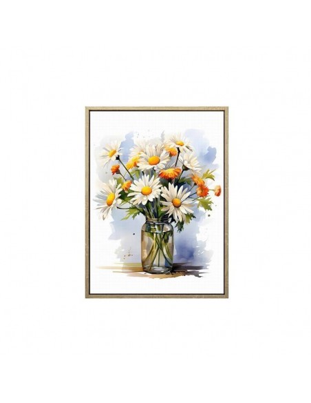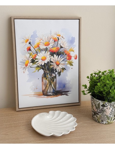 Luminoso y lleno de color, con ilustración artística de un ramo de margaritas y flores naranjas en un jarrón de cristal.