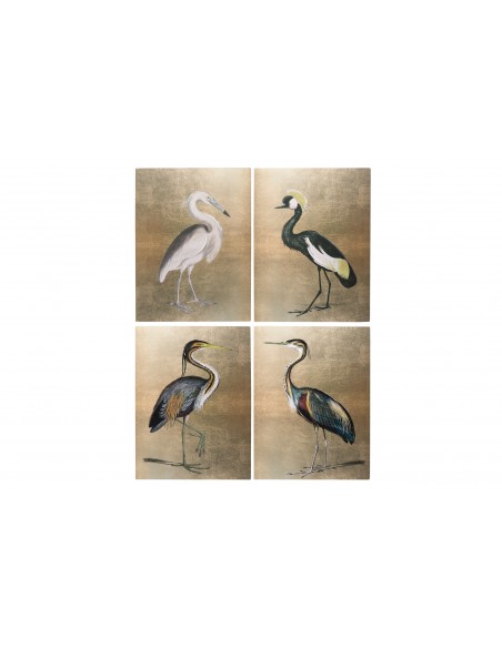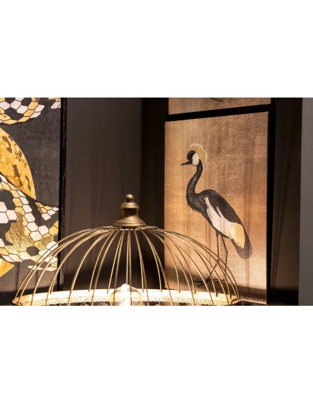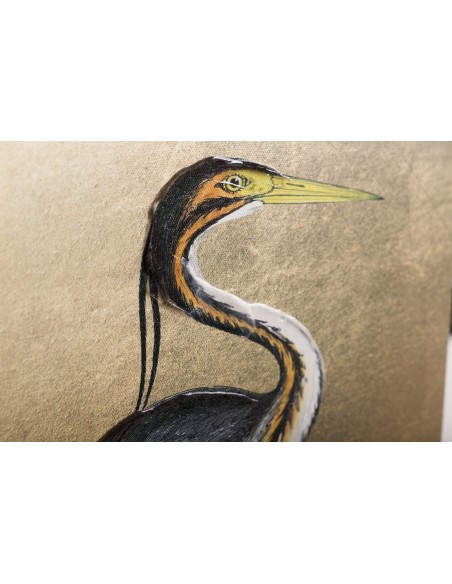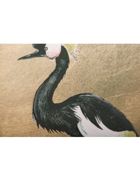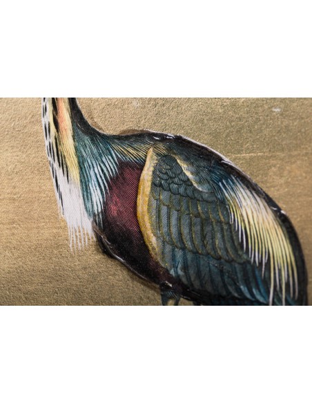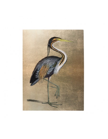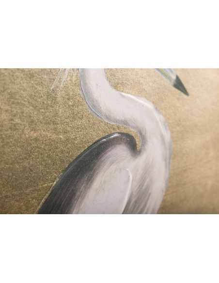 Original cuadro rectangular con un diseño muy elegante de una garza posando sobre un fondo liso dorado y detalles de pinceladas de pintura que lo hacen más original aún.