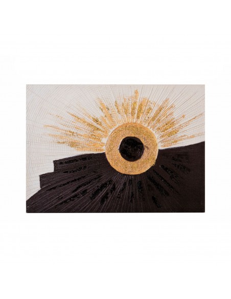 Espectacular cuadro lienzo apaisado rectangular representa un diseño de figuras geométricas con hondas y círculos combinando el dorado, blanco y negro de una forma muy sofisticada.