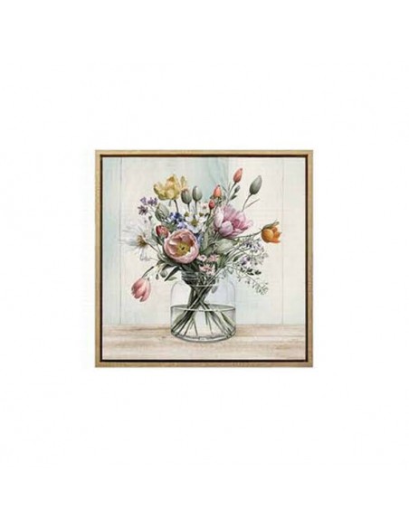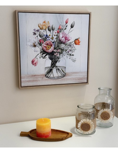 Bonito lienzo que muestra un jarrón de cristal con un ramo de flores silvestres en tonos suaves. El fondo claro y el marco de madera aportan calidez y un aire acogedor que encaja en distintos estilos decorativos.