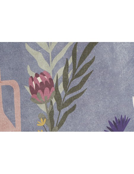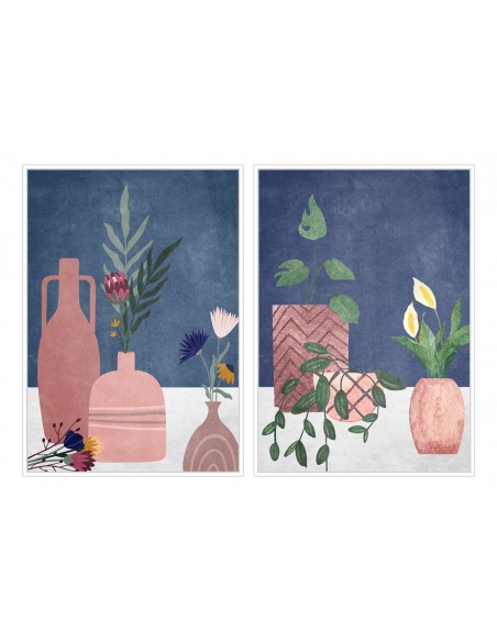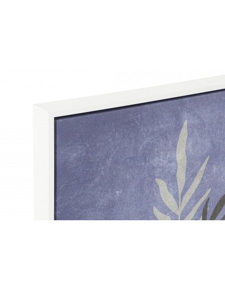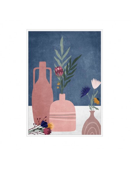 Elegante cuadro lienzo con un marco de madera blanca para darle aún más carácter. Su diseño presenta un diferntes jarrones con flores sobre un fondo azul.