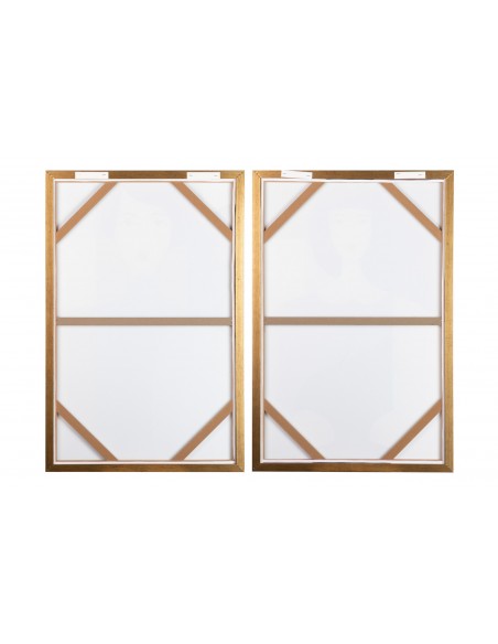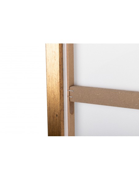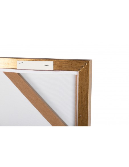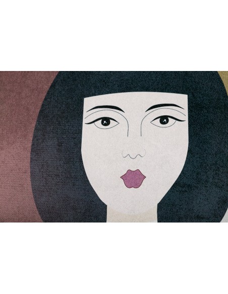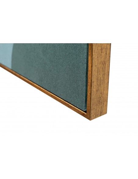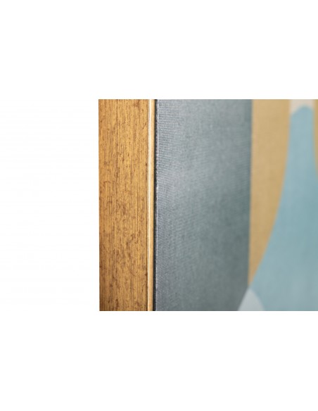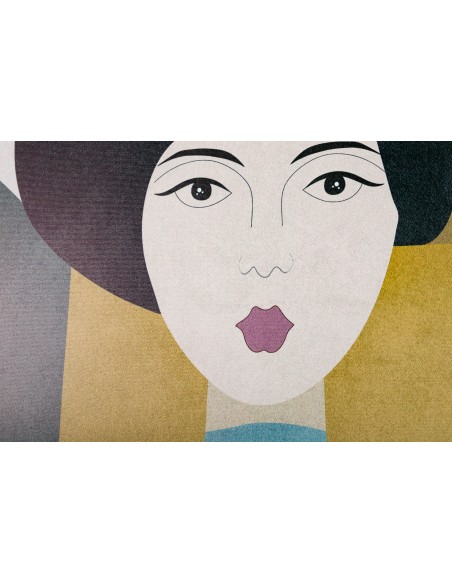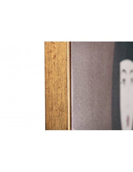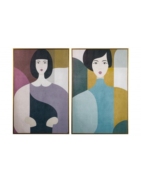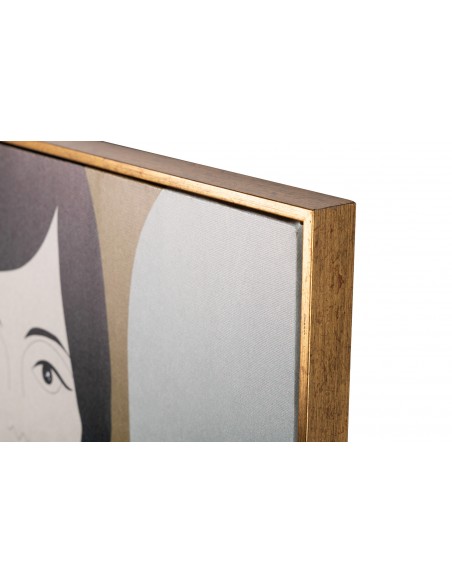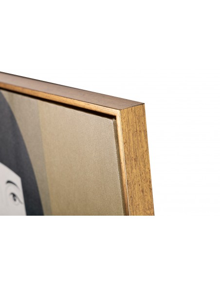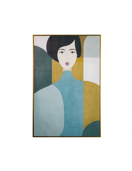 Cuadro lienzo rectangular enmarcado en dorado de una mujer con un diseño abstracto de formas en diferentes colores.
