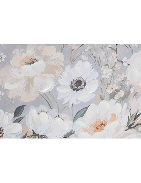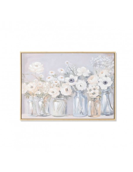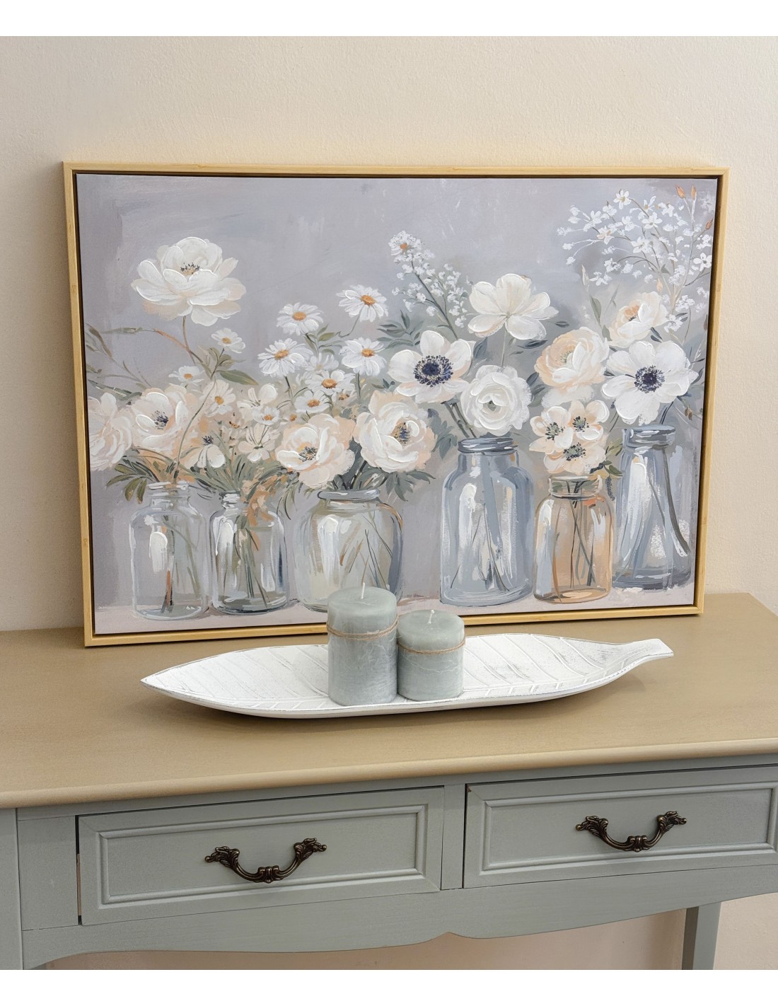 Delicado cuadro lienzo con ilustración de flores blancas y melocotón en jarrones de cristal.