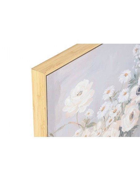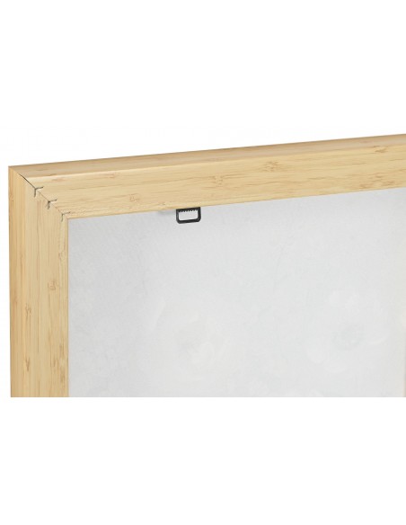 El acabado tiene ligeros relieves en algunas flores y va enmarcado en una estructura de madera clara que aporta calidez y un toque natural.