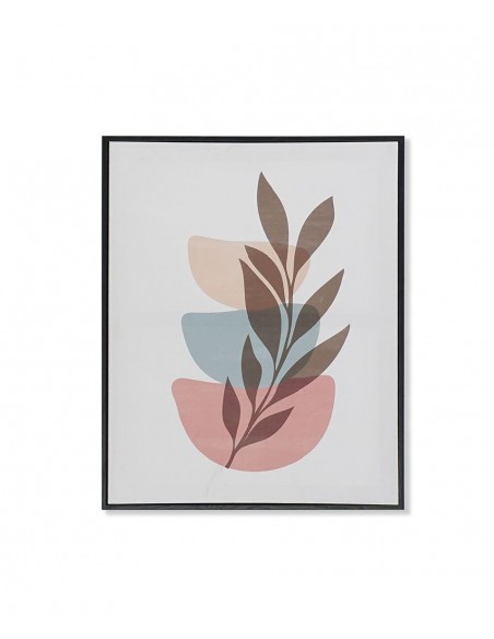 Destaca por tener un dibujo de una hoja sobre varias manchas de color y reforzado con un marco de poliestireno negro.