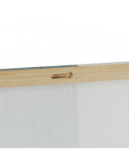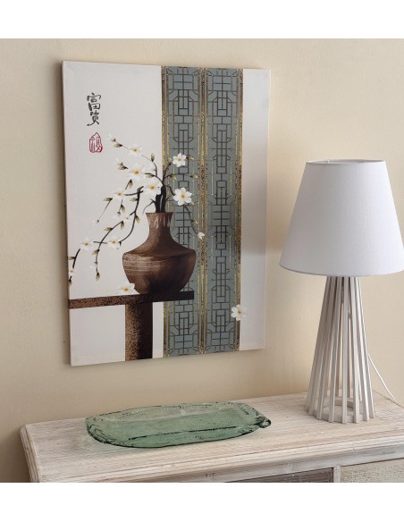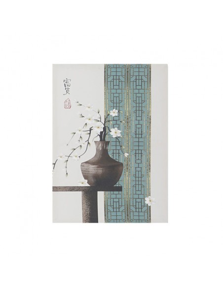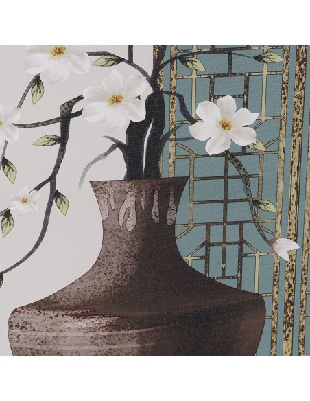 Este cuadro rectangular está impreso en lienzo con una ilustración decorativa de un jarrón marrón con ramas florales blancas sobre fondo claro y detalles geométricos en tonos azules.