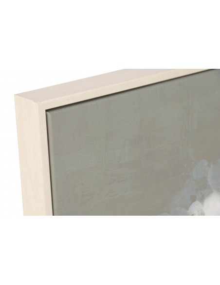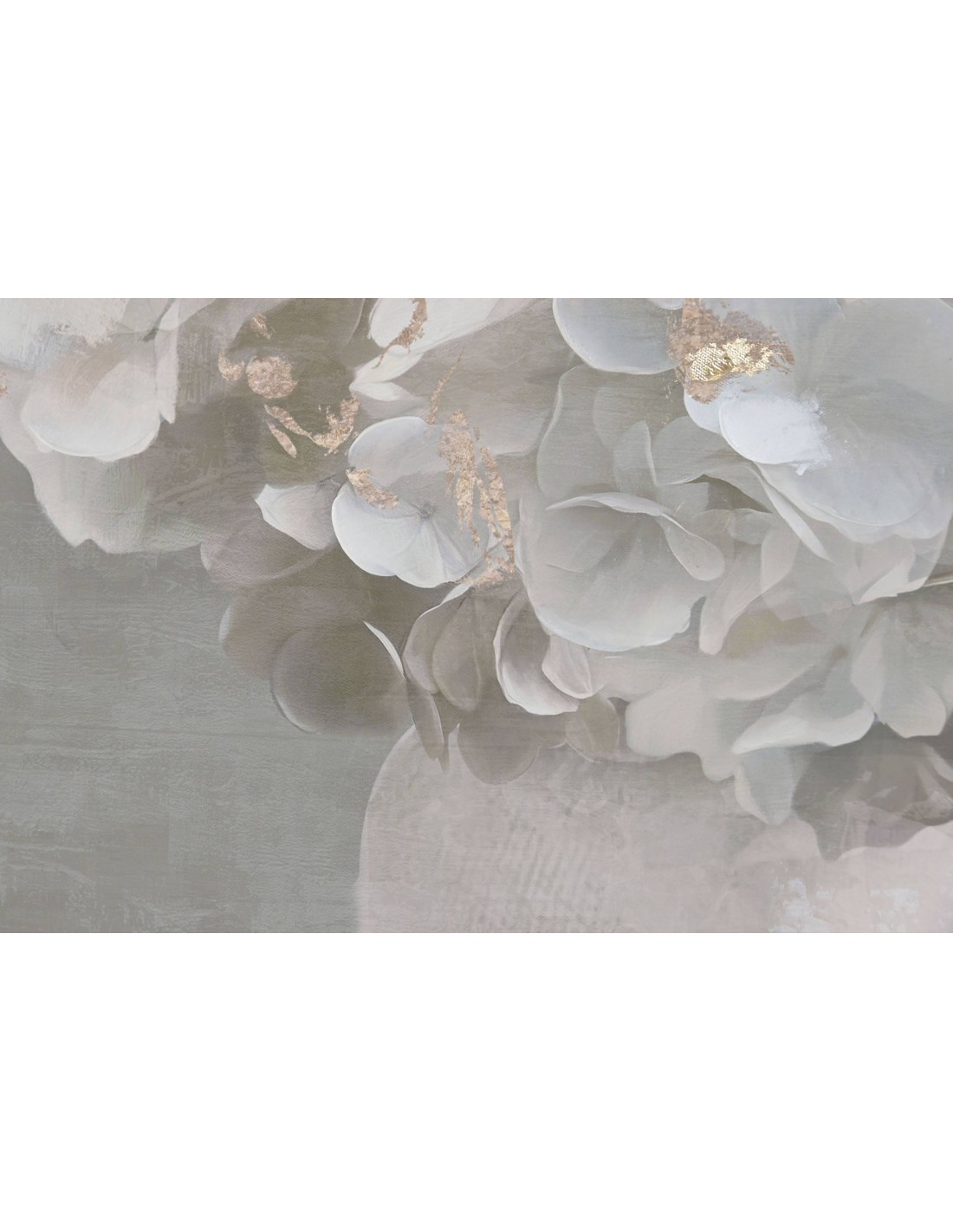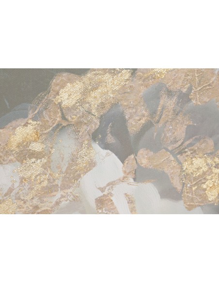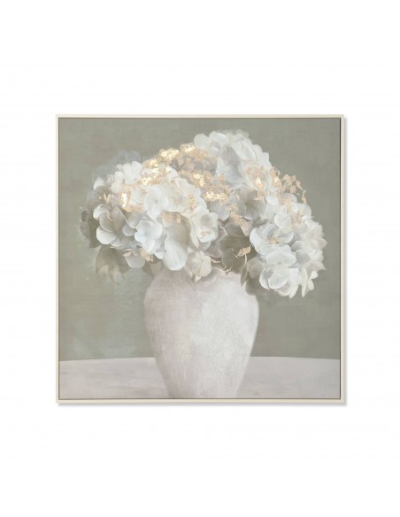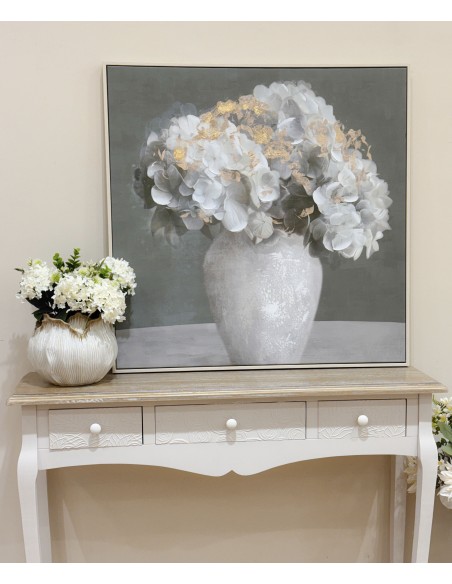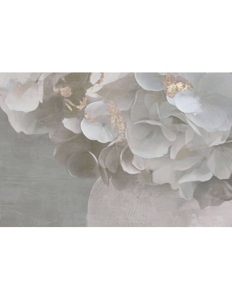 Elegante cuadro sobre lienzo con ilustración de flores blancas en jarrón, realzado con sutiles toques dorados que aportan luz y distinción.