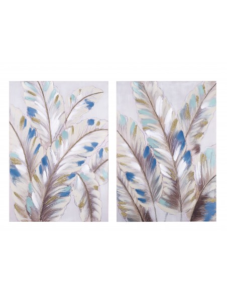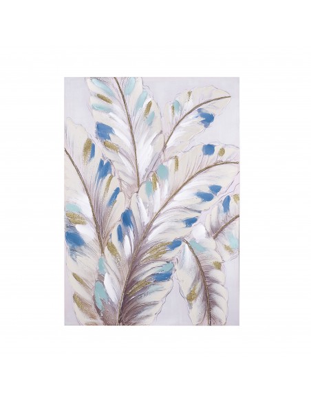 Gran cuadro lienzo rectangular con una hermosas plumas que destaca por sus brochazos azules y detalles dorados que la hacen más original aún.
