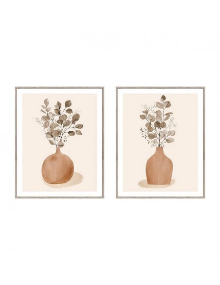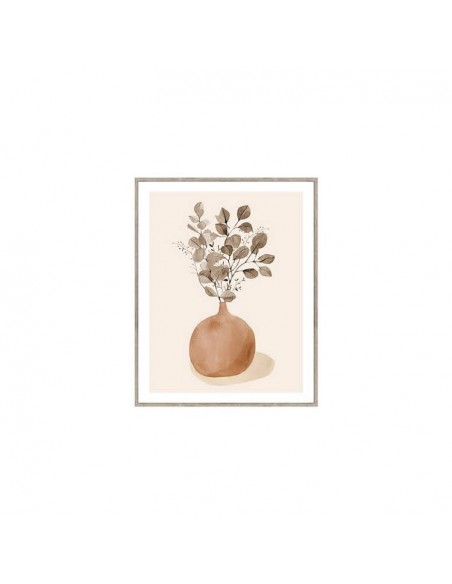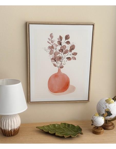 Bonito lienzo con marco de madera que muestra un jarrón en tonos terracota con ramas secas dibujadas en un estilo muy suave y decorativo.