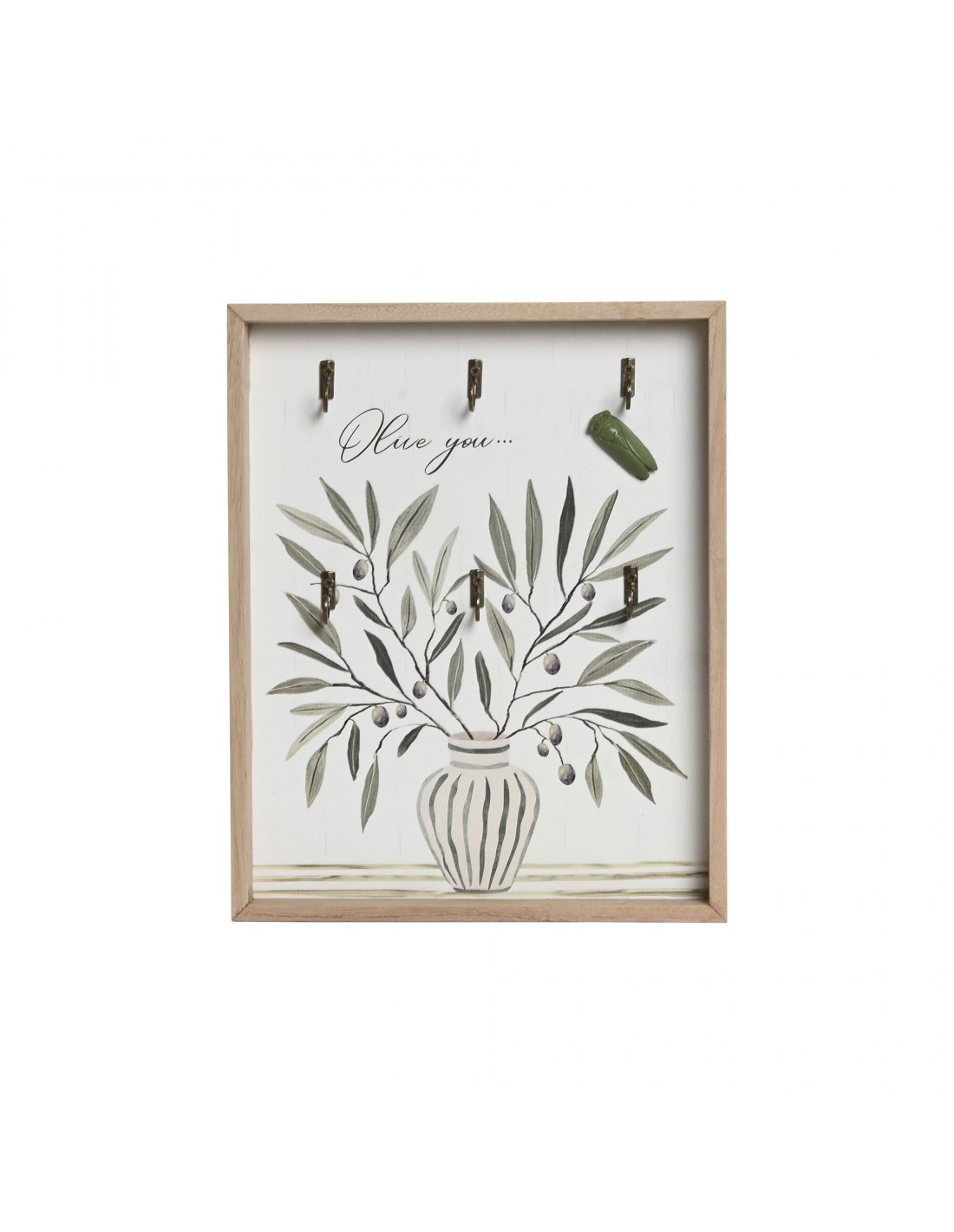 mdfColgador de llaves de madera mdf decorado con ilustración de ramas de olivo y jarrón, acompañado de la frase “Olive you…” y un simpático detalle de cigarra en relieve.