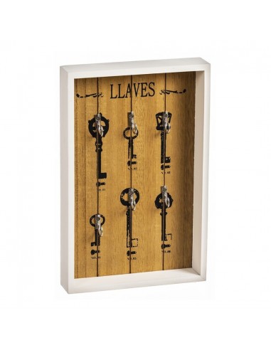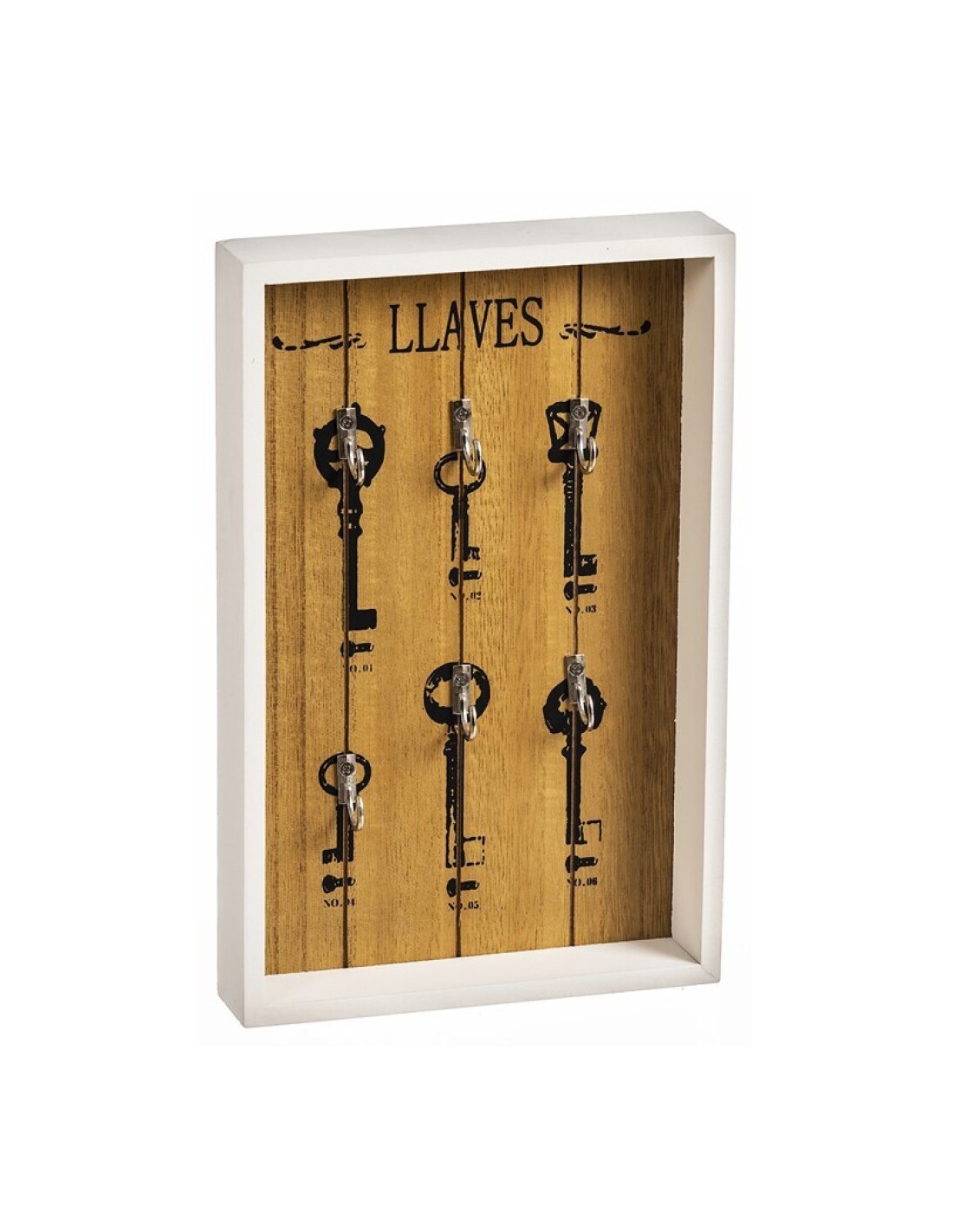 Práctico colgador de llaves con estructura de madera enmarcada y fondo decorativo estilo rústico con ilustraciones de llaves antiguas.