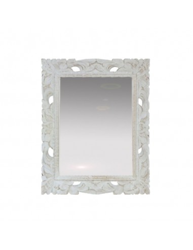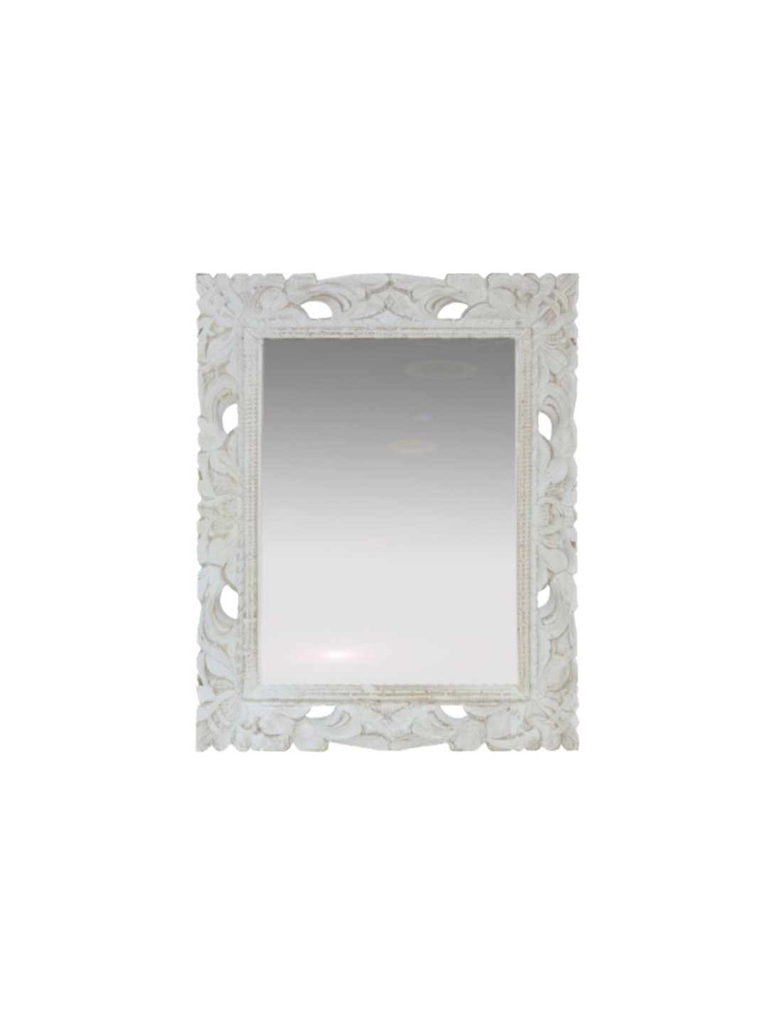 Fabuloso espejo rectangular con marco de madera tallada y tono blanco desgastado que dará un toque muy mediterráneo cualquier estancia de tu casa.
