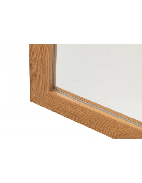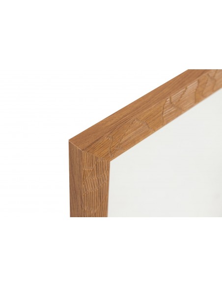 Este espejo rectangular destaca por su marco en tono madera con sutil grabado, perfecto para ambientes serenos y naturales.