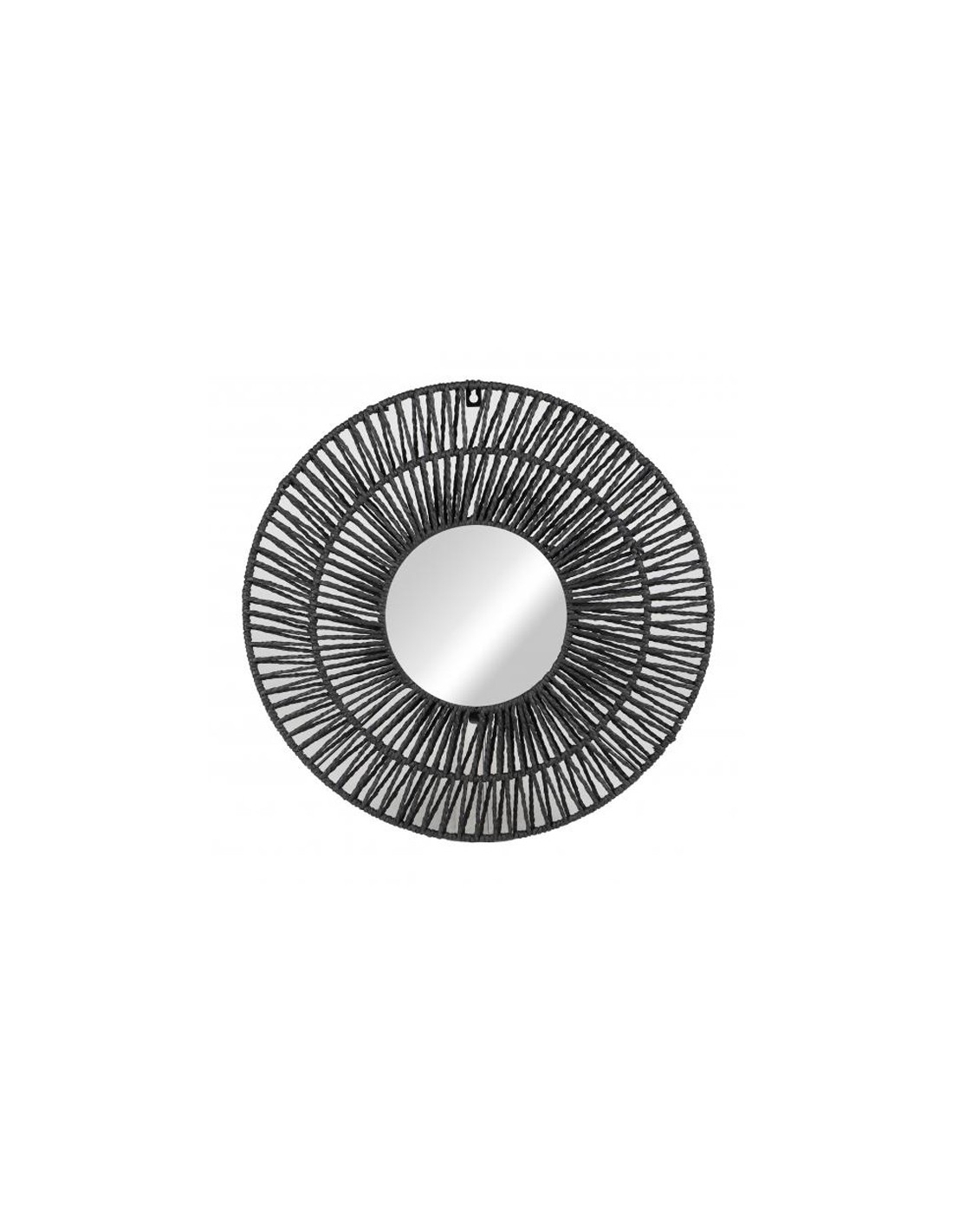 Decorativo espejo redondo con marco de cuerda de papel trenzada en color negro, con diseño radial que le aporta un aire moderno y artesanal al mismo tiempo.