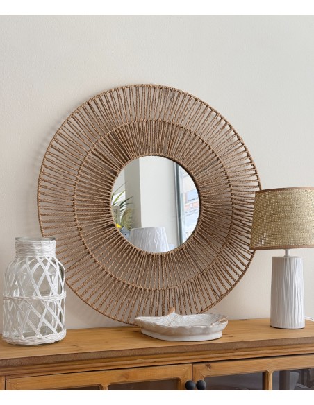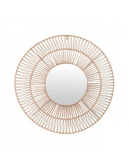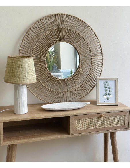 Este espectacular espejo de 70cm y con forma redonda vestirá tus paredes con mucho estilo. Destaca por estar compuesto por varas de rafia en tono natural que le dan un acabado asombroso.